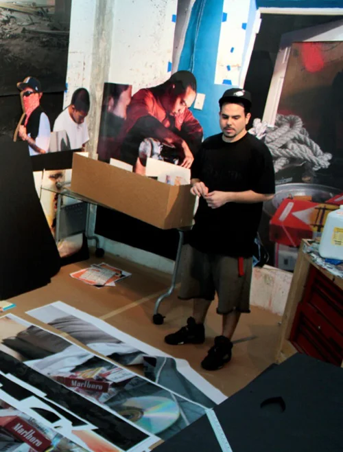 Collaged acrylic on canvas paintings, inkjet prints, paper, charcoal, acrylic, and spray paint on canvas